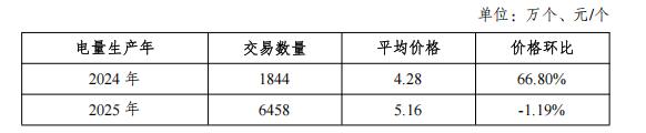2025年11月,电量生产年为2024年的绿证交易平均价格4.28元/个,电量生产年为2025年的绿证交易平均价格5.16元/个。