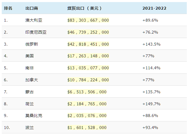 另外,有个很意思的事情。在煤炭宝统计去年全球煤炭出口国数据时,发现2021年-2022年全球各国煤炭出口金额数据排序还挺有玄机的。需要特别指出的是,澳大利亚去年煤炭出口数量约为3.47亿吨,虽然数量不是出口最多的,但是出口金额高达833亿美元,排名全球第一。但是呢?我们猜测澳大利亚事实上并不是幕后真正获益最大的资本大佬和国家。为什么这么说呢?可以听我们细细分解。