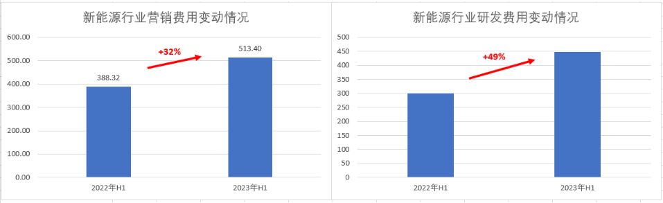 从行业整体投入情况来看,新能源行业上半年营销与研发投入体量都有较大提升,不过对比下来,还是遵循着研发>营销的逻辑。