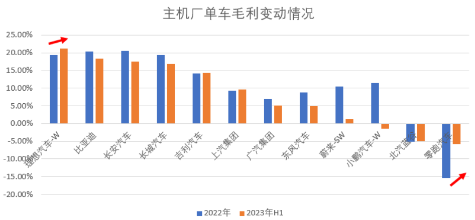 从上半年的数据来看,在上半年水深火热的价格战中,行业整体单车毛利率均值下降2pct,从去年年底的10.86%调整到到2023年H1的8.24%。除了理想继续一骑绝尘外,只有少数企业一定程度改善了自身单车毛利,比如零跑、吉利等。